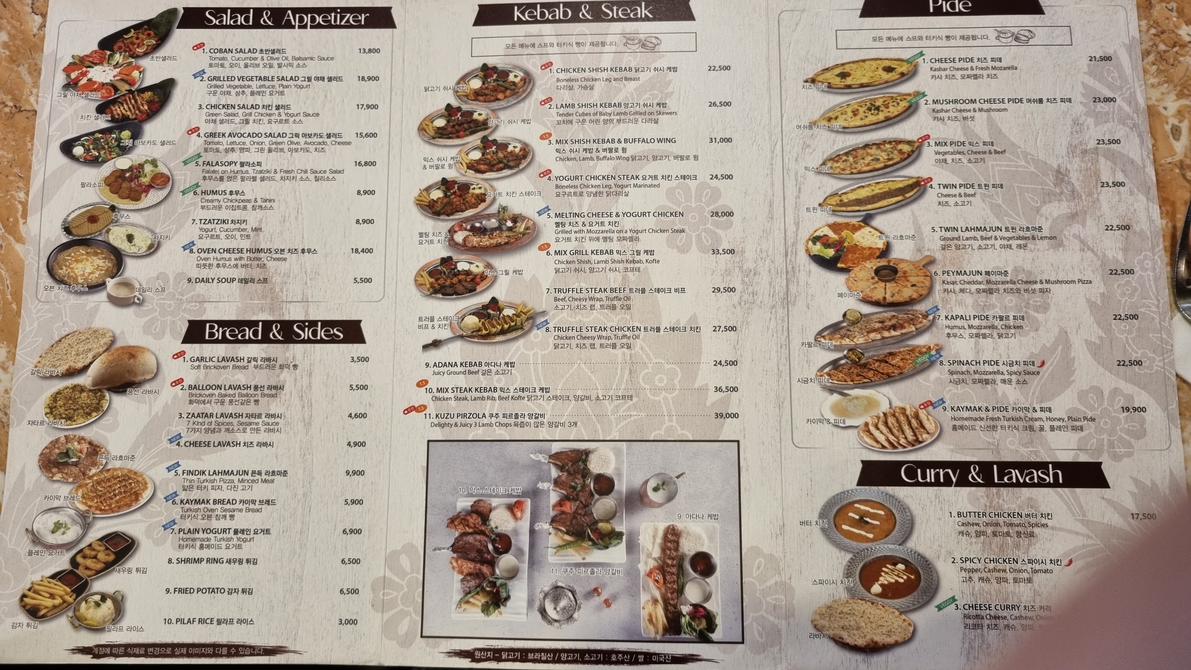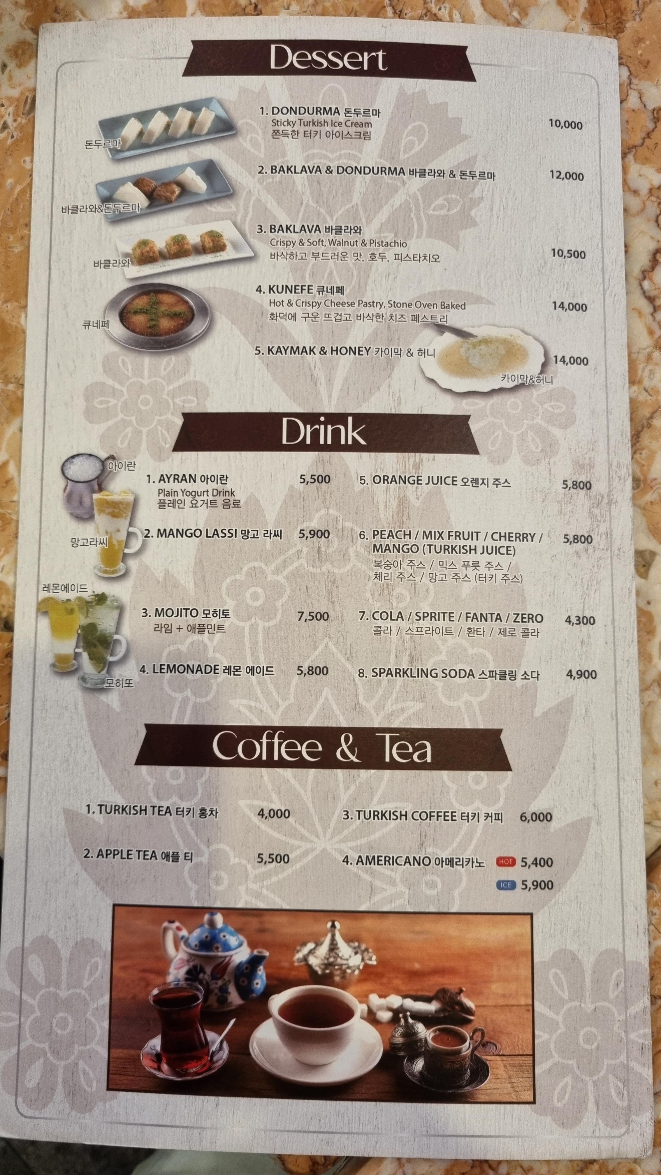 다른 터키 음식점과 같이 케밥의 베리에이션들을 생각하음.