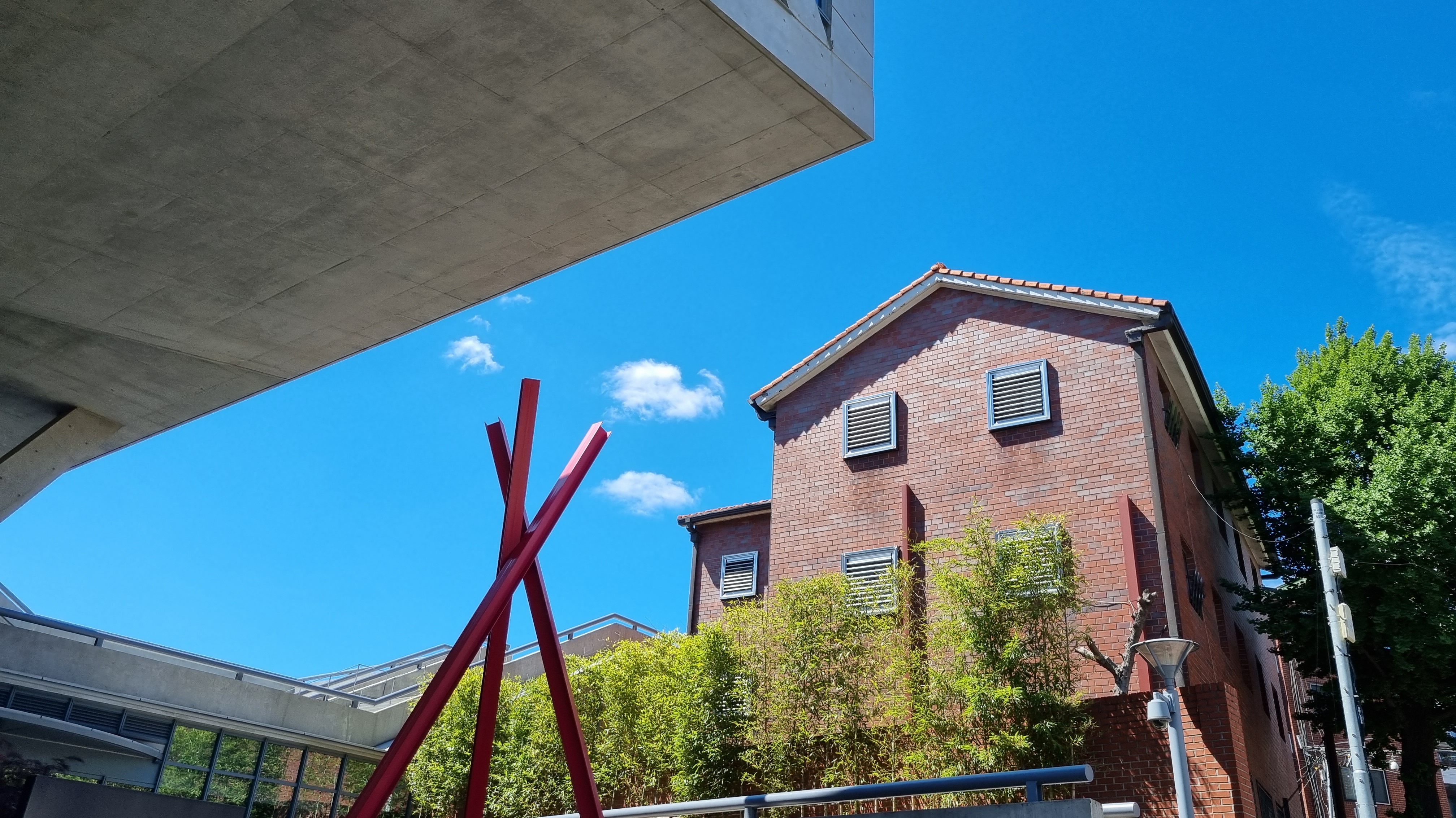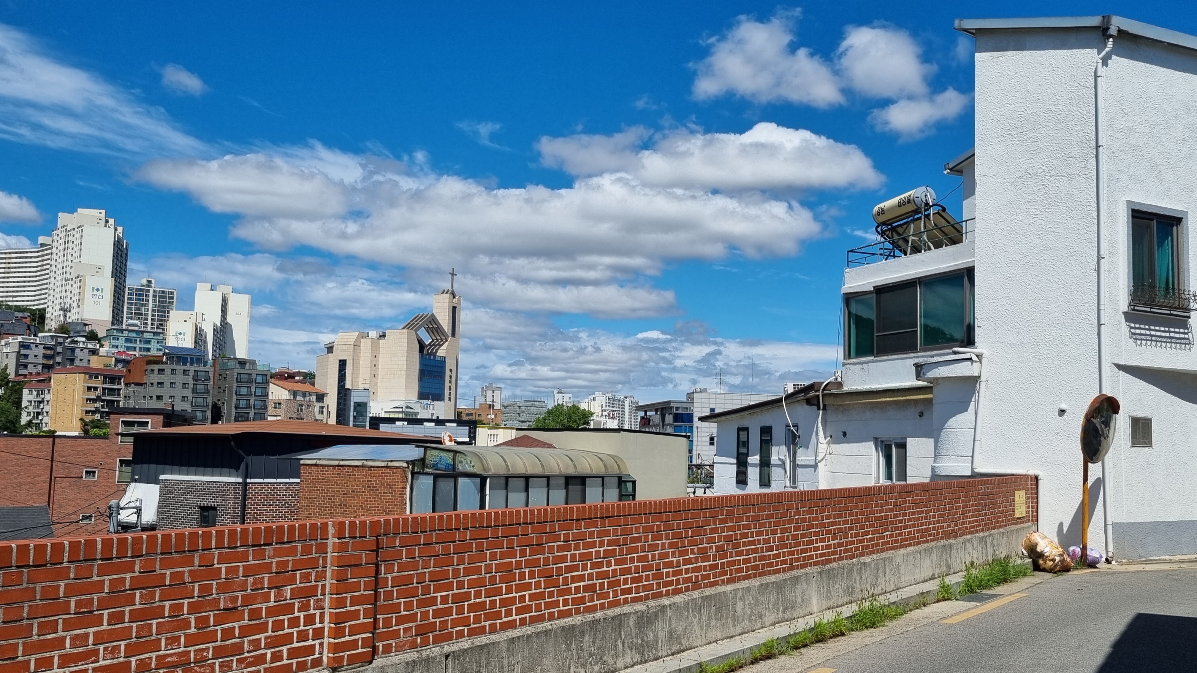 그 뒤에 현대식 건물. 청소가 안 된 듯한 검은 흘러내림이 오히려 감각적임. 옥상 공간의 파라솔에서 뭔가 여유가 느껴짐.