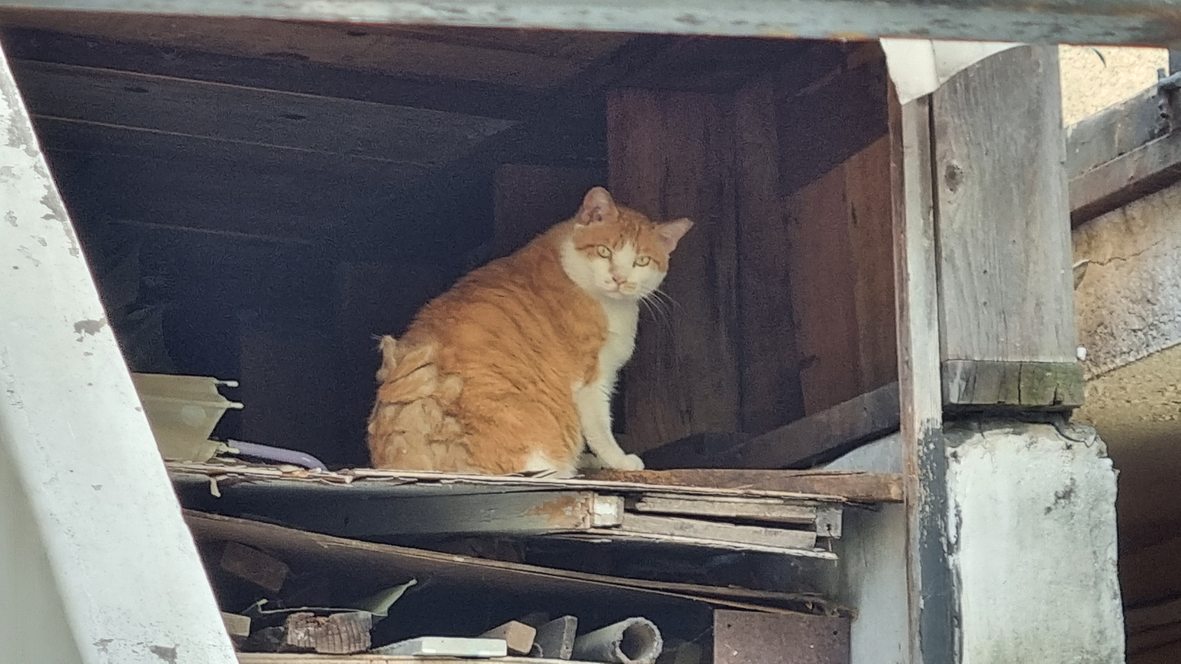 어느 집 창고 공간에 있던 그루밍하는 고양이.
