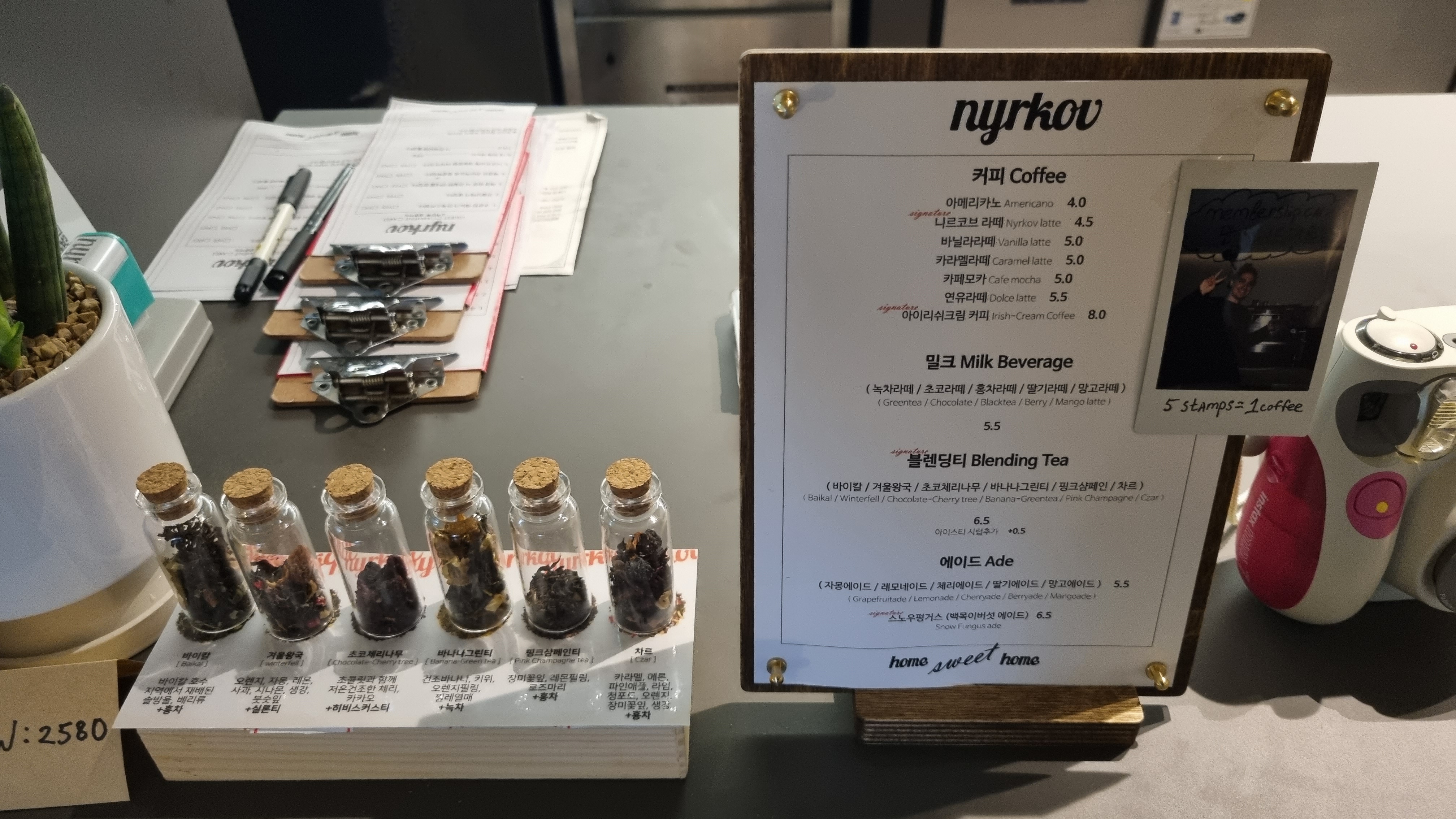 음료는 커피, 라떼, 블렌딩 티, 에이드 류를 팔고 있음.