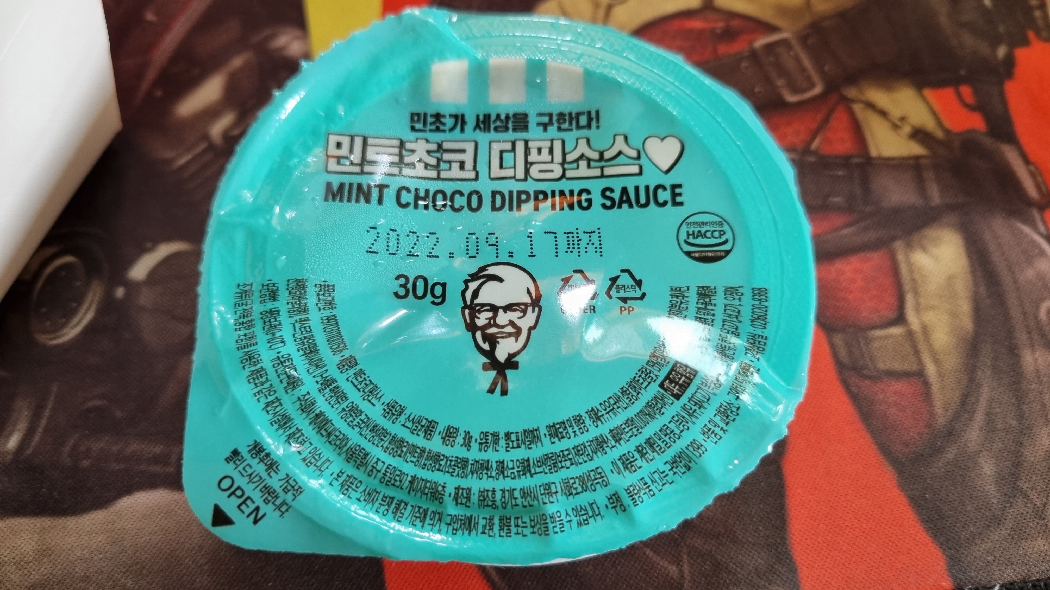 KFC 와 배달의 민족 콜라보로 '민트 초코 디핑 소스(민초 디핑 소스)' 가 출시되었다는 광고 문구를 봄.