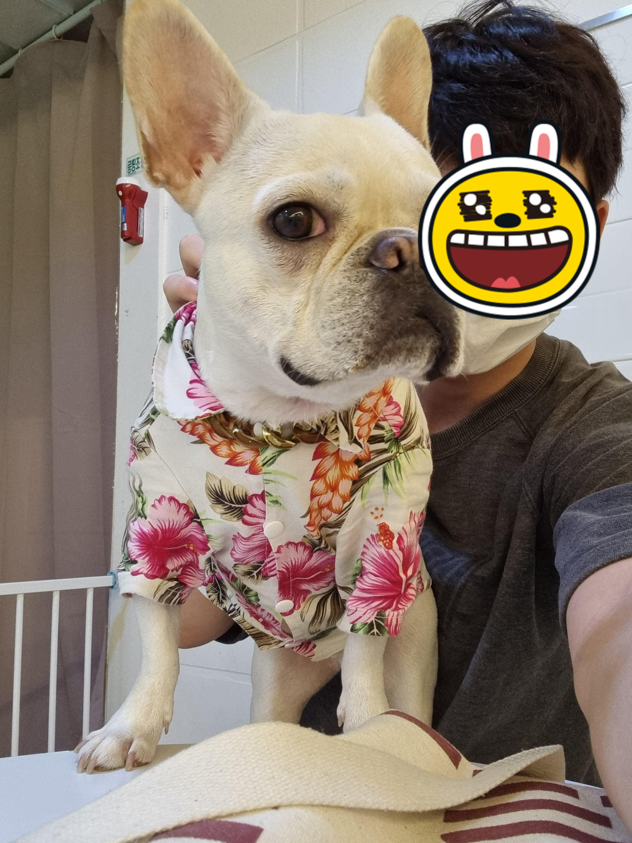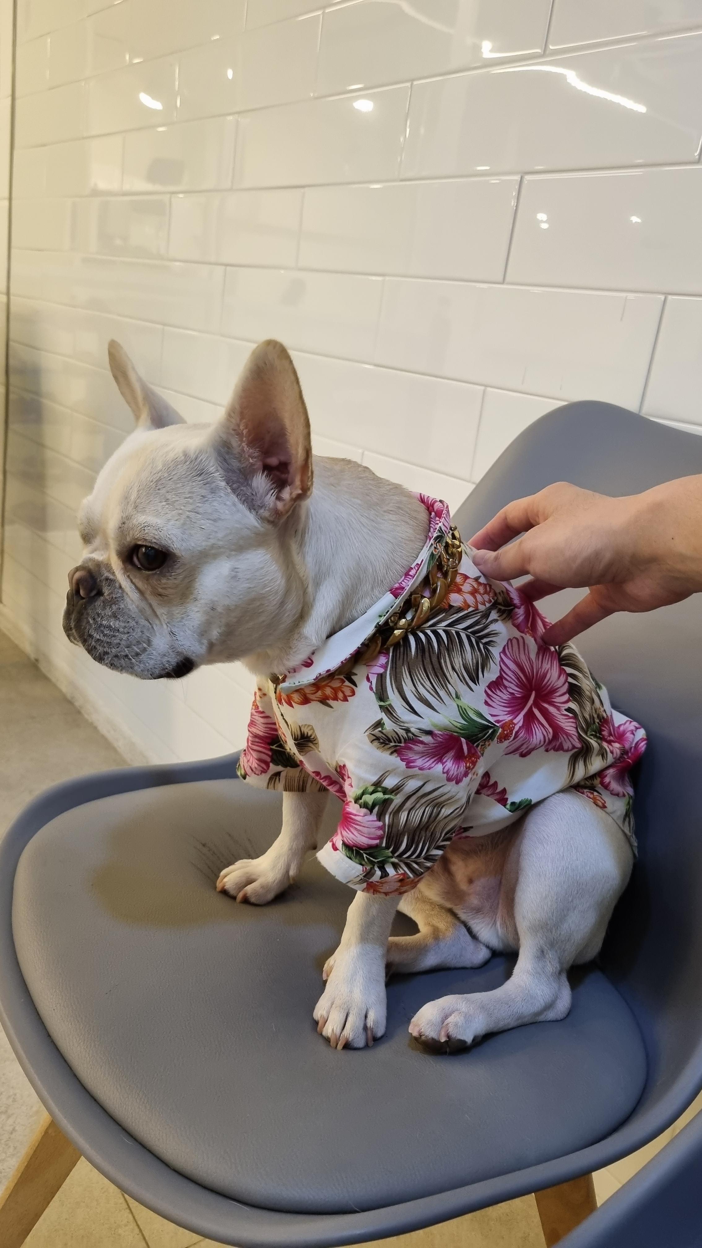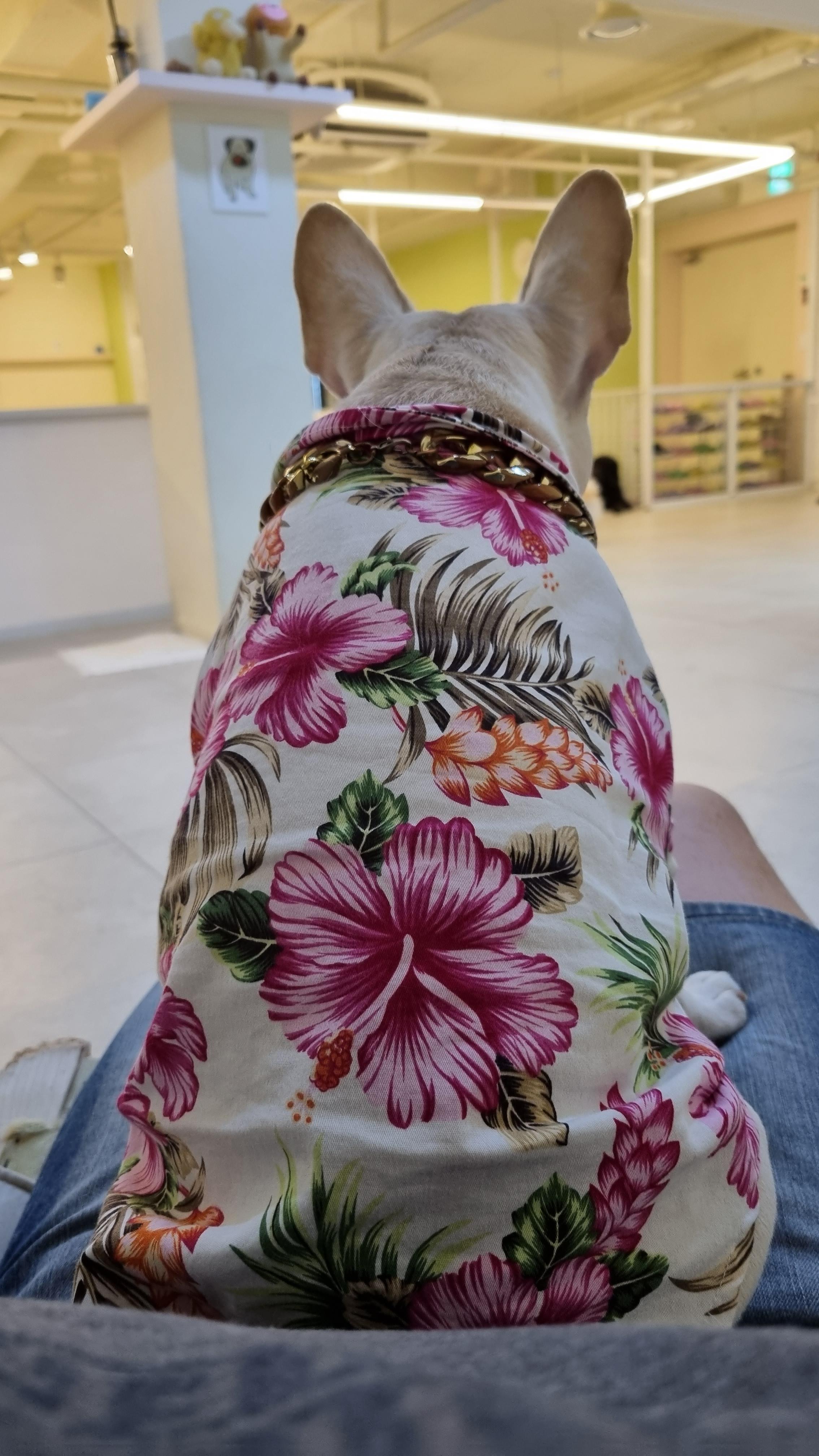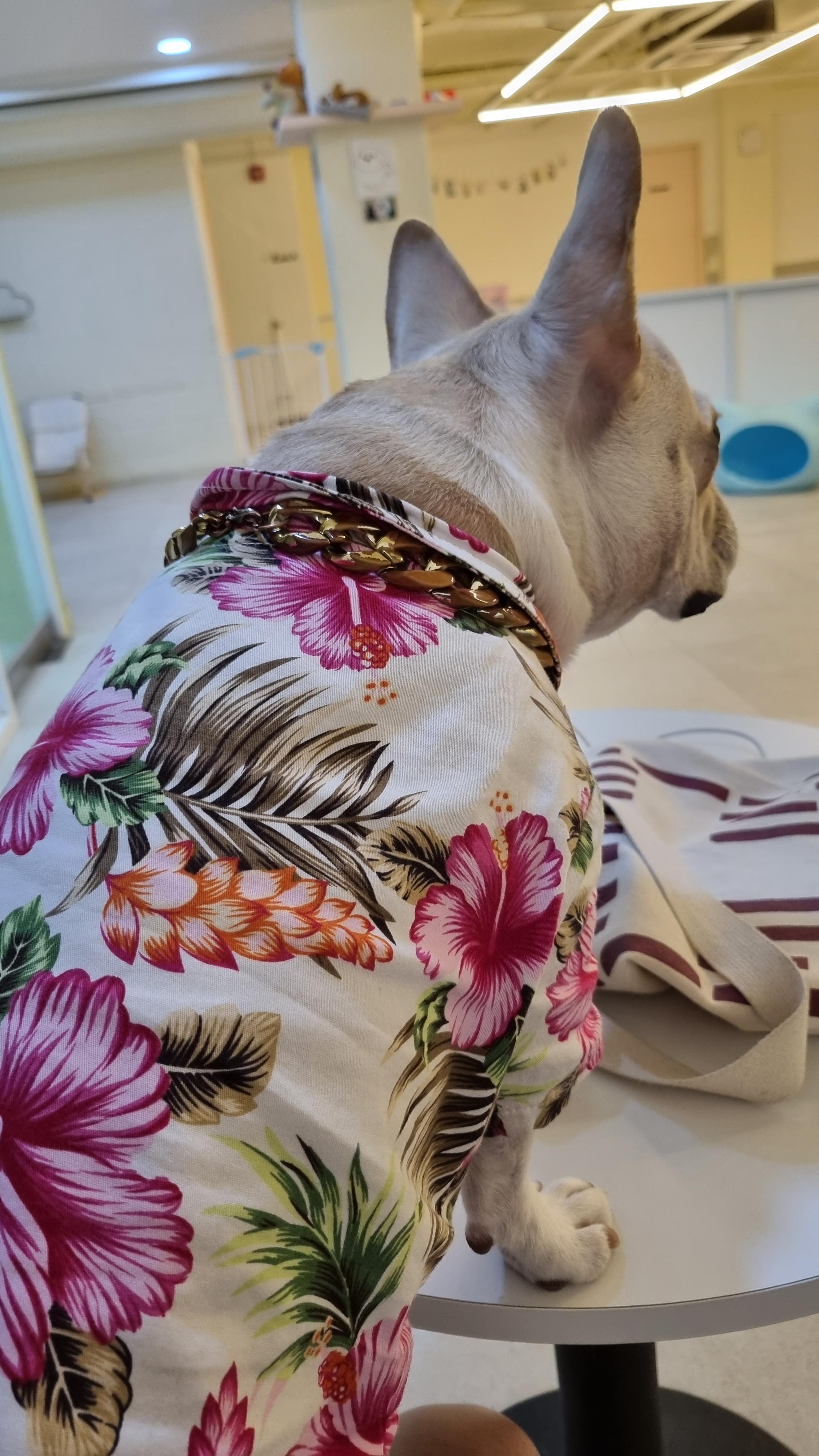 금목걸이에 꽃남방을 입은 귀여운 강아지.
