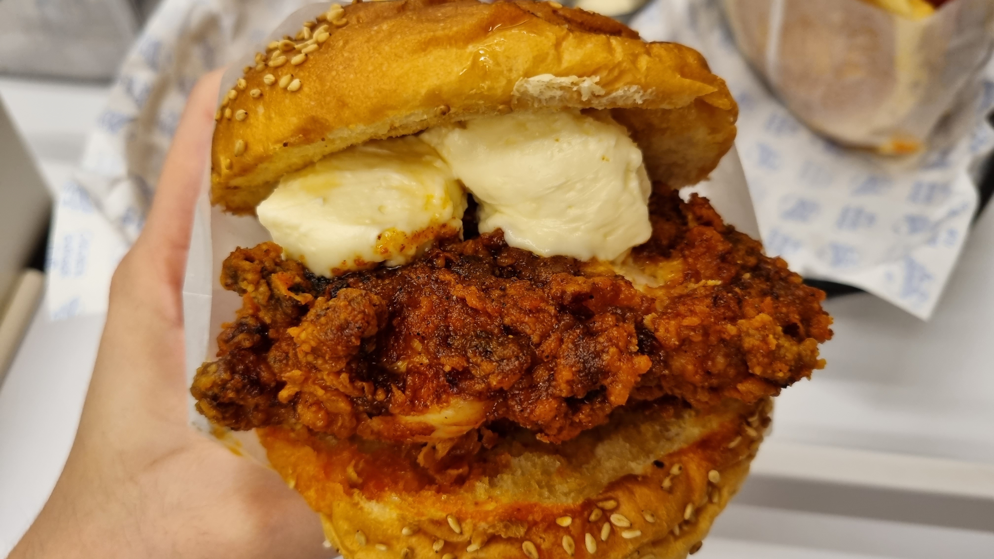전체적인 맛이 엄청나다기보다는 매콤한 치킨 패티와 어울어지는 부드럽고 고소한 크림의 그 오묘한 조합, 새로운 맛이 기분 좋게 해줌.